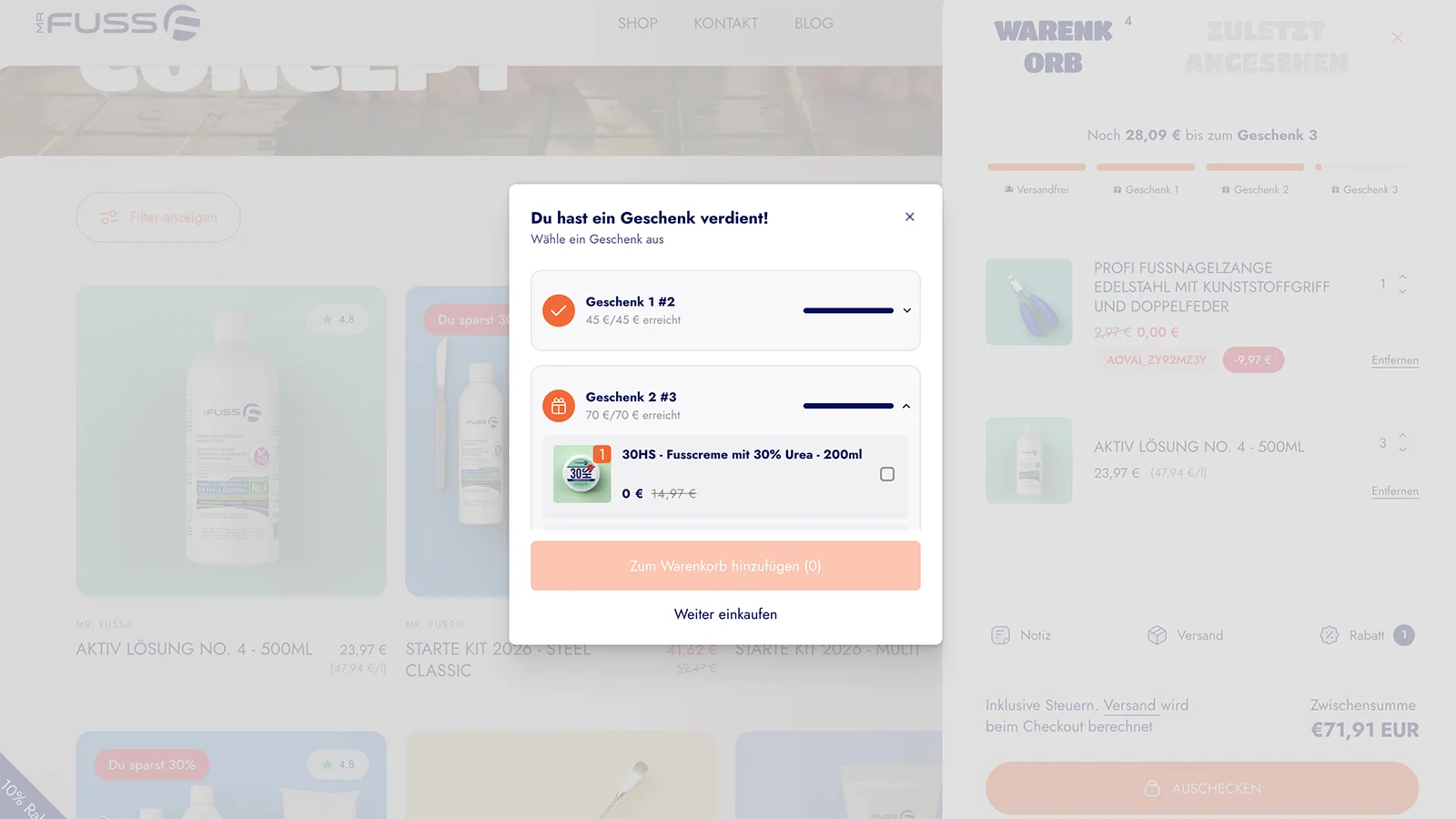 Bei Mr. Fuss kannst du bei deiner Bestellung bei 3 Bestellwert-Schwellen jeweils 1 Geschenk auswählen. So kannst du mit deiner Bestellung bis zu 3 Geschenke absahnen.