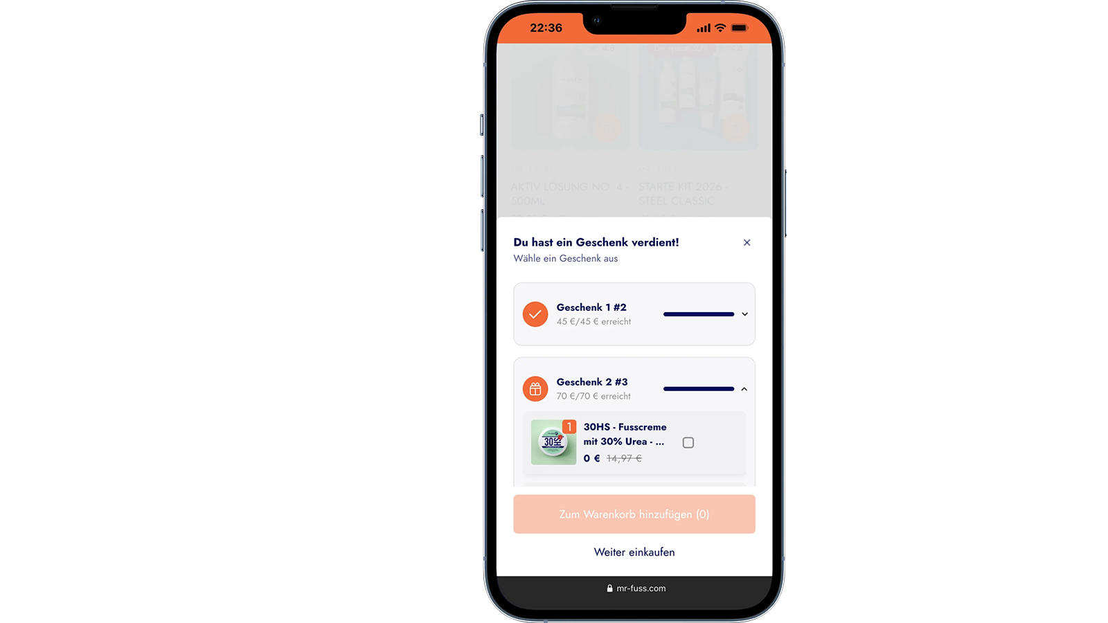 Und so funktioniert es. Sobald dein Warenkorb einen Bestellwert über einem Schwellenwert erreicht hat, erscheint ein Popup, das dir die Geschenke anbietet.
